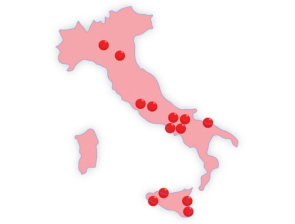 Augusta, Bari, Bologna, Catania, Caserta, Foggia, Frosinone, Mazara de Vallo, Milano, Napoli, Pagani e Nocera, Palermo, Roma.